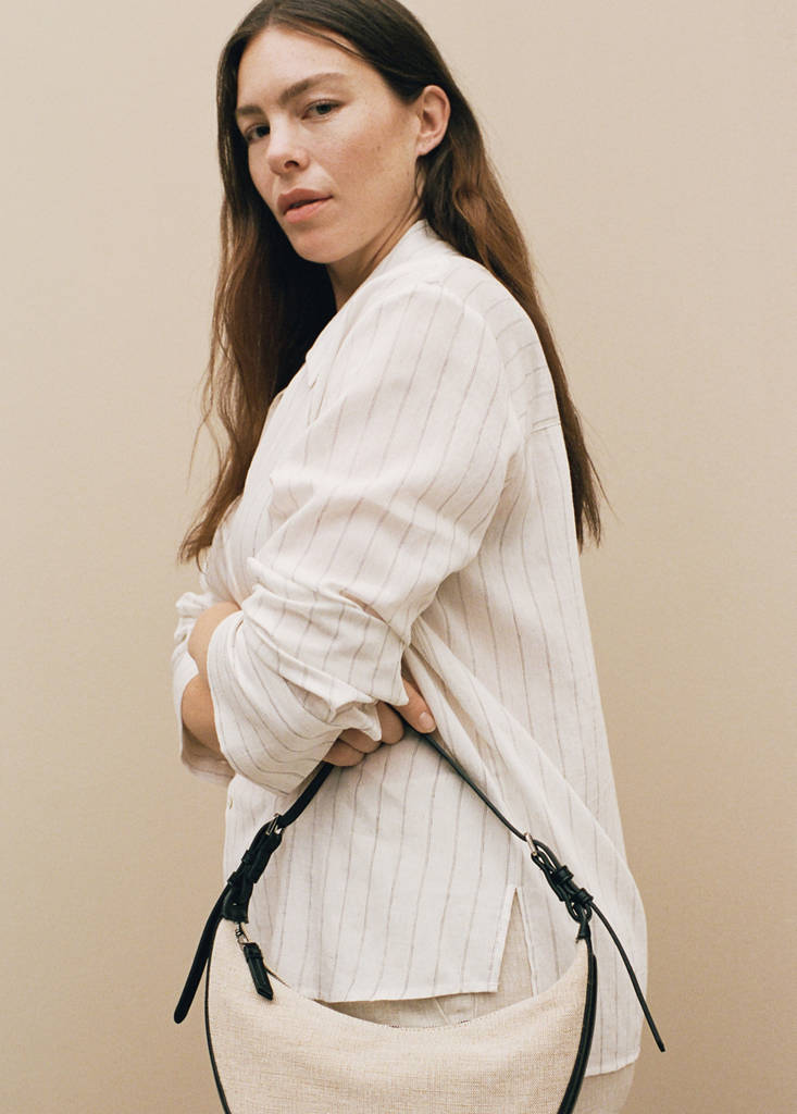 Small size. Cotton and linen blend fabric. Oval design. Shoulder strap. Adjustable buckle handle. Zip closure
