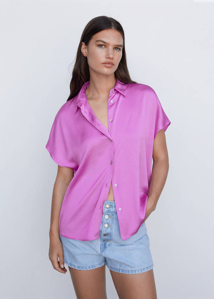 Fluid fabric. Straight design. Satin finish. Shirt collar. Short sleeves. Button fastening at the front. Office looks