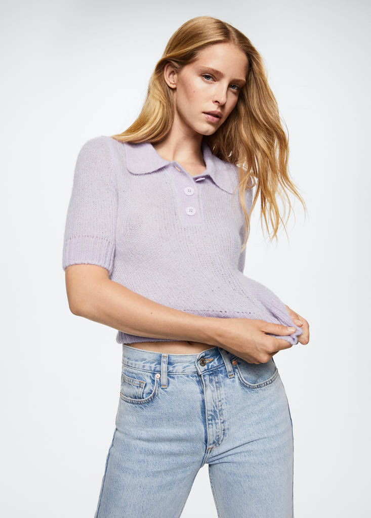 Medium knit. Straight design. Short design. Polo neck. Three quarter sleeve. Button fastening on the front section. Cable knit finish