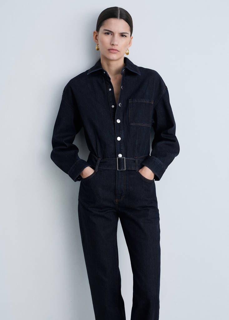 100% Cotton. Denim-style cotton fabric. Long design. Straight design. Shirt collar. Long sleeves with buttoned cuffs. Belt loops. Belt buckle fastening. Jeans with tie closure. Front snap button closure. Inner lining