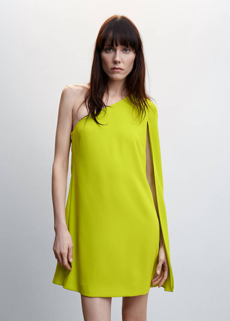 Flowy fabric. Straight design. Short design. Asymmetric design. Long sleeve. Side zip fastening. Inner lining. Party and events collection