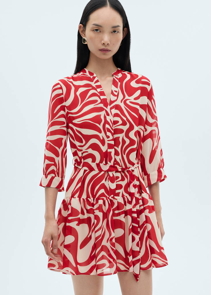 Fluid fabric. A-line design. Ruffled design. Short design. Abstract-print. Stand-up collar. V-neckline. Puffed three quarter sleeves. Buttoned cuffs. Button fastening at the front. Adjustable belt. Adjustable waist tie