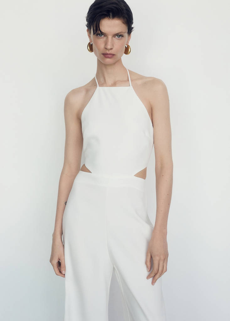 Fluid fabric. Crop design. Back closure. Halter neck. Sleeveless. Invisible back zip fastening. Bow fastening on the neck. Inner lining. Lightweight fabric. Straight design. Party, ceremony and communion collection. Long design. Cut-out. Opening detail. Lining only. Round neck. This garment belongs to our event collection, designed to make you the perfect guest at any party, wedding or ceremony