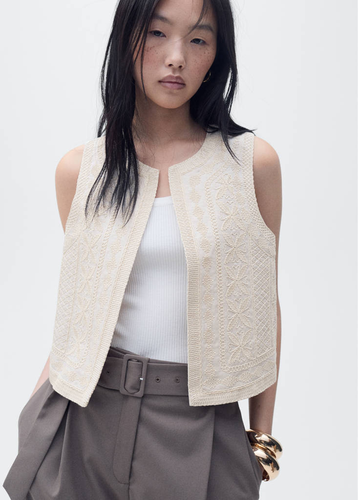 100% linen fabric. Embroidered design. Crop design. Straight Design. Round neck. Sleeveless. No Fastening