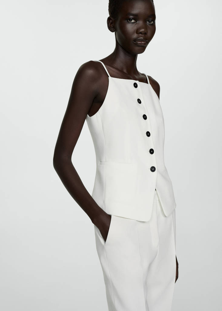 Halter-neck gilet with buttonsPrice historyInitial price struck through [€ 45,99 ]€ 45,99Current price [€ 34,99 ]€ 34,99-24%Select a colourWhiteThe model is wearing size S and is 180cm tall.Select your sizeXSNot available. I want it!SNot available. I want it!MNot available. I want it!LNot available. I want it!XLNot available. I want it!Notify meHalter neck. Sleeveless. Thin straps. Two front welt pockets. Inner lining. Fitted design. Front closure with buttonsDetails, composition and careStore availability