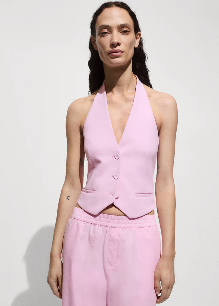 Halter-neck gilet with buttonsPrice historyInitial price struck through [€ 39,99 ]€ 39,99Second price struck through [€ 30,99 ]€ 30,99Current price [€ 12,99 ]€ 12,99-68%Select a colourPinkThe model is wearing size S and is 178cm tall.Select your sizeXSNot available. I want it!SNot available. I want it!MNot available. I want it!LXLLast few items!AddCrop design. Straight design. Halter neck. Sleeveless. Inner lining. Front closure with buttons. Two front welt pocketsDetails, composition and careStore availability