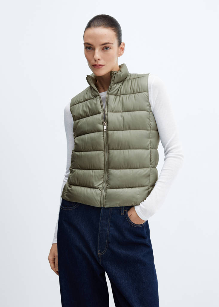Quilted fabric. Straight design. High neck. Sleeveless. Two side pockets with one press stud fastening. Zip fastening on the front section. Inner lining. Available Plus. The white colour is an online exclusive. Water-repellent: The durable finish of this garment protects against light rain, repelling contact with water and raindrops. Short design. Side zip pockets. Recycled polyester padding
