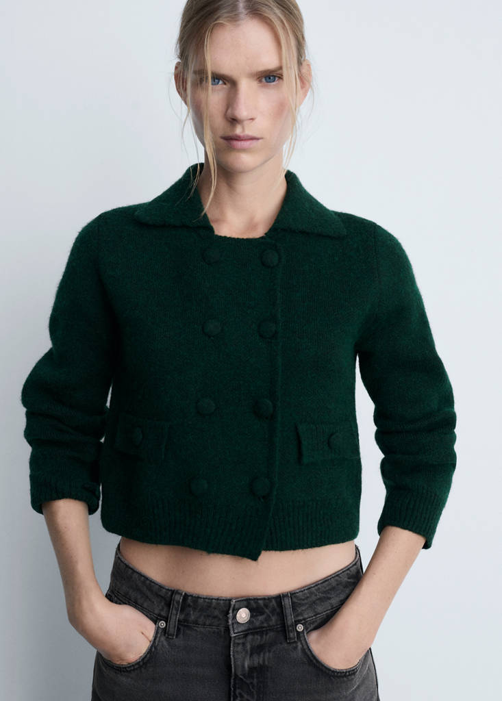 Knit fabric. Straight design. Shirt collar. Long sleeves. Two front welt and flap pockets. Button fastening at the front. Double button fastening