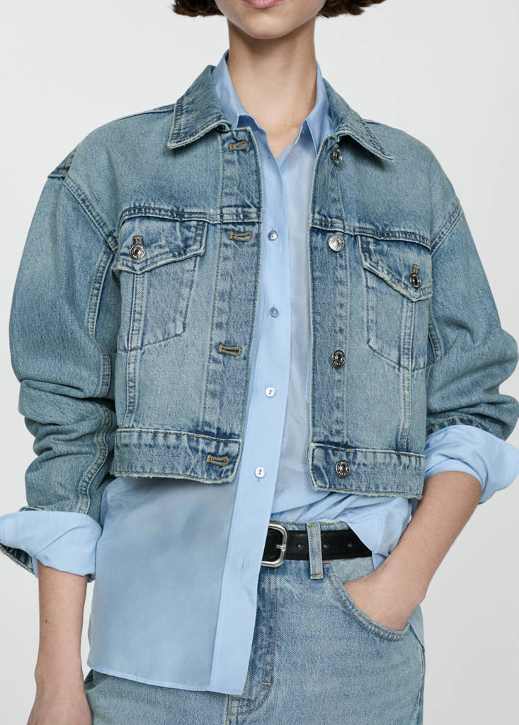 Denim-style cotton fabric. Short design. Straight design. Notched lapel collar. Long sleeves with buttoned cuffs. Twin buttoned flap pockets at front. Button fastening at the front