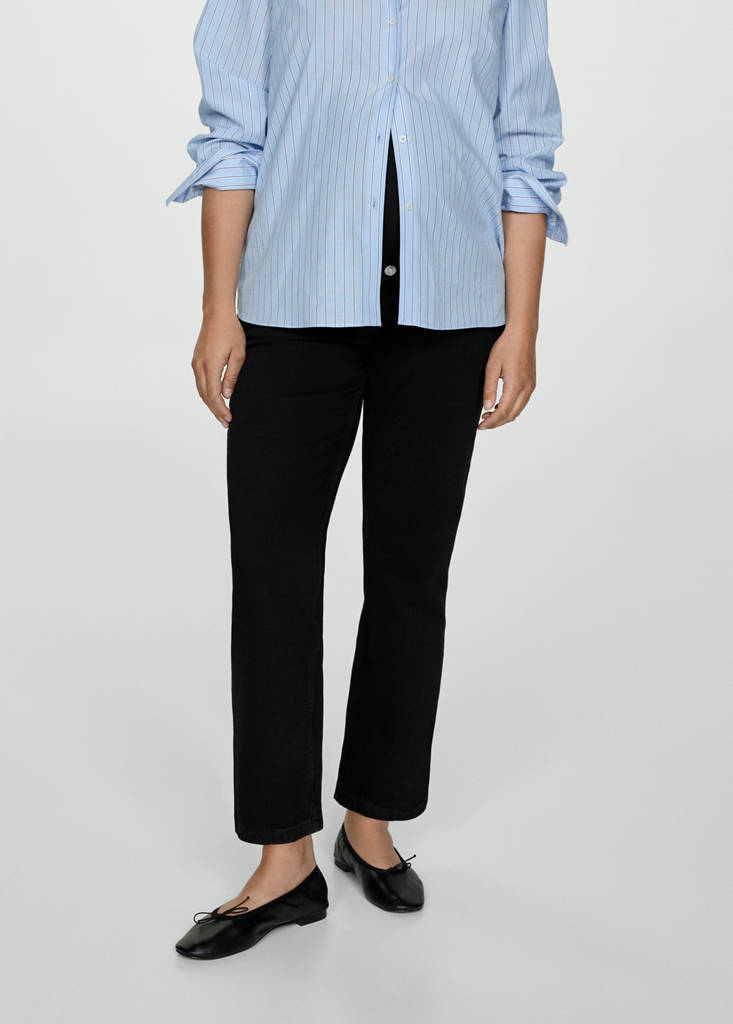 Denim-style cotton fabric. Straight design. Crop design. Low waist. Belt loops. Five pockets. Elasticated waistband. Soft elastic at front side waistband for added comfort and support the growing bump. No Fastening. Decorative button. Inseam 66 cm. We recommend you buy your usual size. Provides comfort and freedom of movement. Maternity