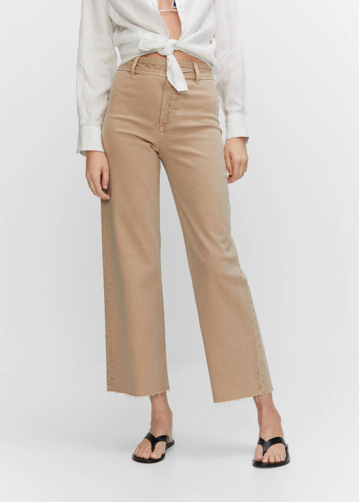 Denim style cotton fabric. Elastic. Culotte design. Wide-leg design. High waist. Ankle brace. Loops. Two welt pockets on the front. Back pockets. Zip and one button fastening. Inseam 72 cm. Plus Size Available