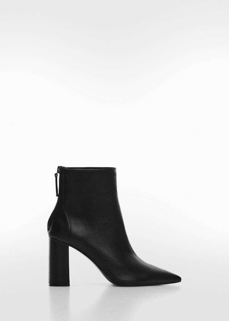 Pointed-toe ankle boot swith zip closurePrice historyInitial price struck through [€ 49,99 ]€ 49,99Current price [€ 38,99 ]€ 38,99-22%Select a colourBlackSmall garment - Choose one size up from the usualSelect your size35Not available. I want it!36Not available. I want it!37Not available. I want it!38Not available. I want it!39Not available. I want it!40Not available. I want it!41Not available. I want it!42Not available. I want it!Notify meFaux leather. Pointed. Rectangular heel. Back zip fastening. 8 cm heelDetails, composition and careStore availability