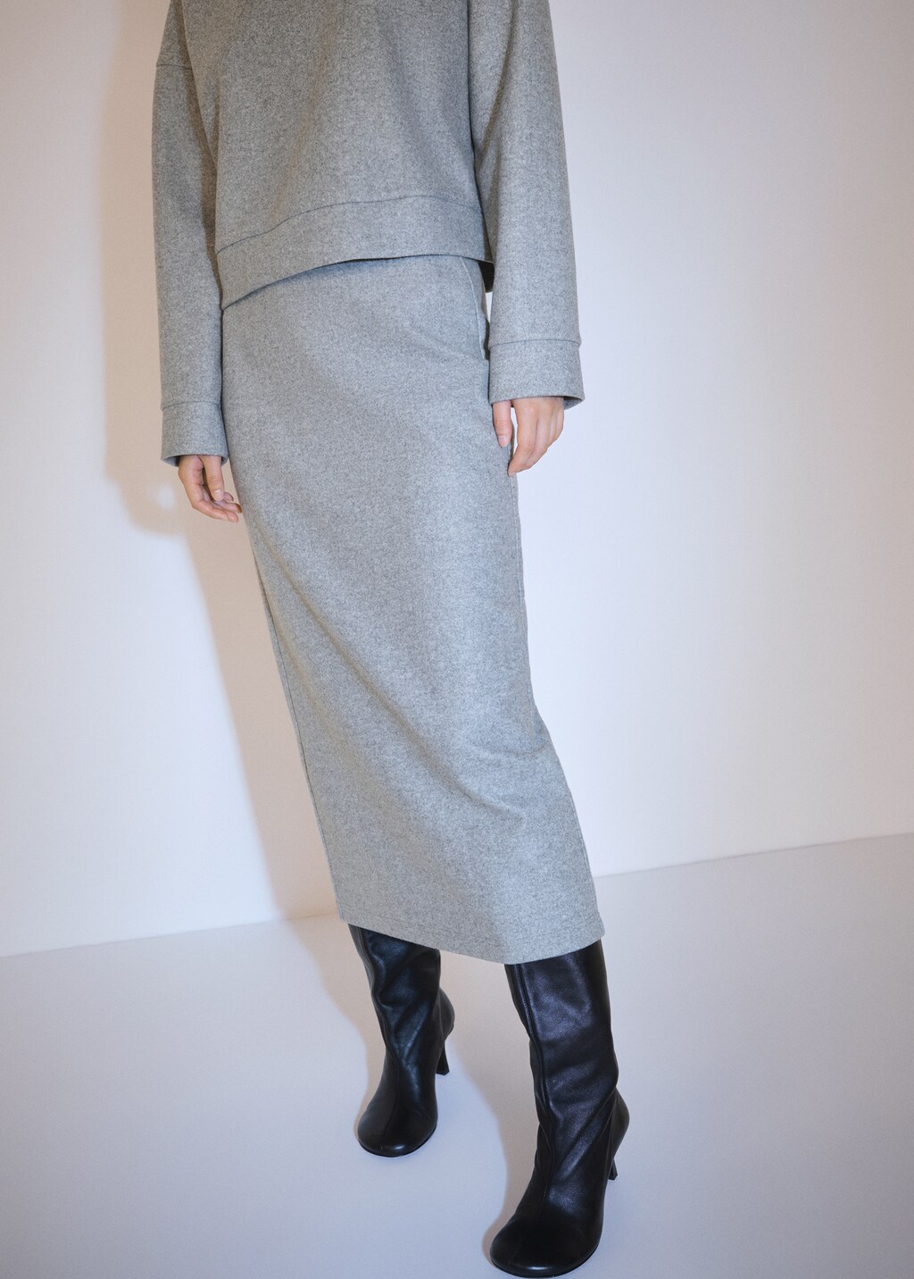 Long design. Straight Design. No Fastening. Back-slit hem. Total look. Felt fabric. Elasticated waistband.