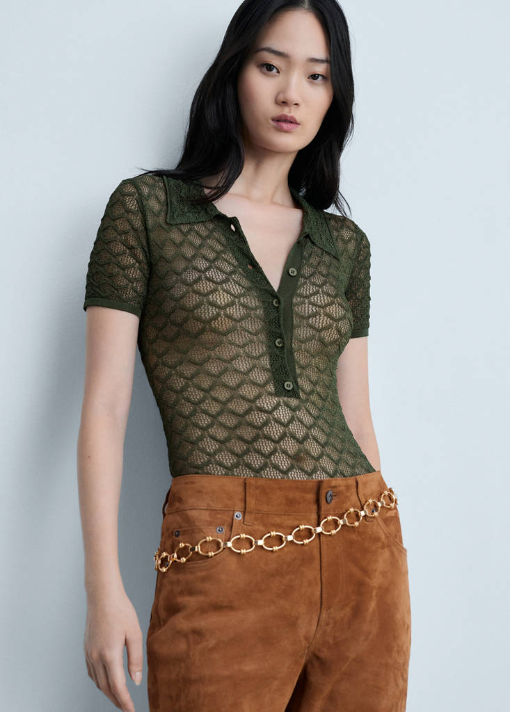 Fine knit fabric. Openwork fabric. Semi-transparent design. Polo collar. Short sleeves. Button fastening at the neck. Metal snap closure