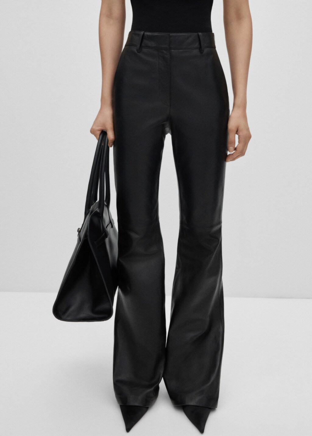 100% ovine leather. High waist. Long design. Bell design. Two side pockets. Two welt pockets at the back. Belt loops. Concealed button, hook and zip fastening. Inner lining. Selection Collection. Flare design.