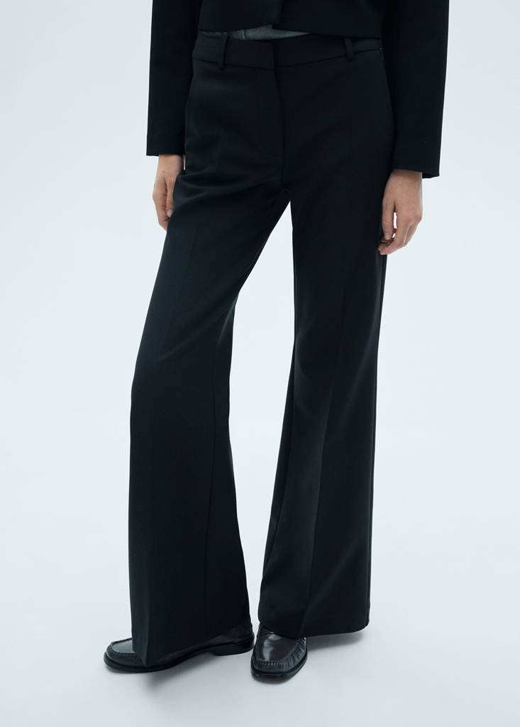 Flared design. Mid-rise. Belt loops. Side pockets. Concealed button, hook and zip fastening. Total look