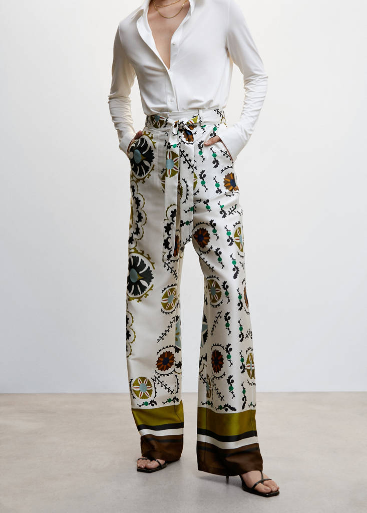 Satin. Palazzo design. Long design. Printed design. Medium waist. Loops. Two side pockets. Concealed button, hook and zip fastening. Printed tie