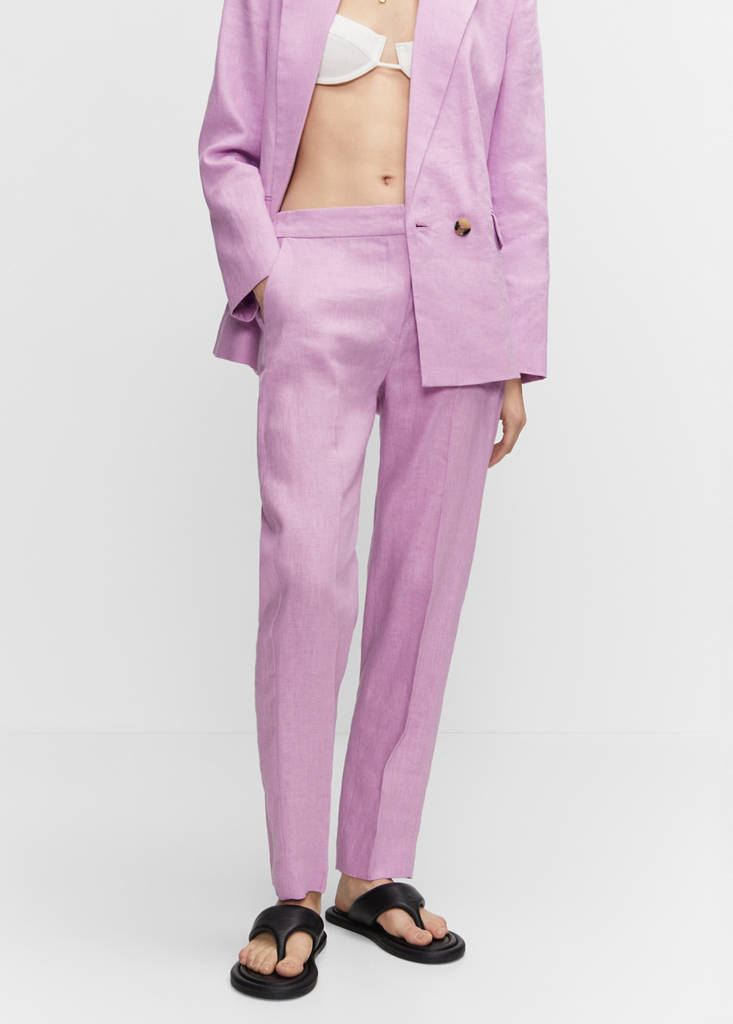 100% linen fabric. Suit style. Elastic pleated on the waist. Concealed button, hook and zip fastening. Two side pockets. Two welt pockets on the back. Plus Size Available. Co-ord. The purple colour is an online exclusive