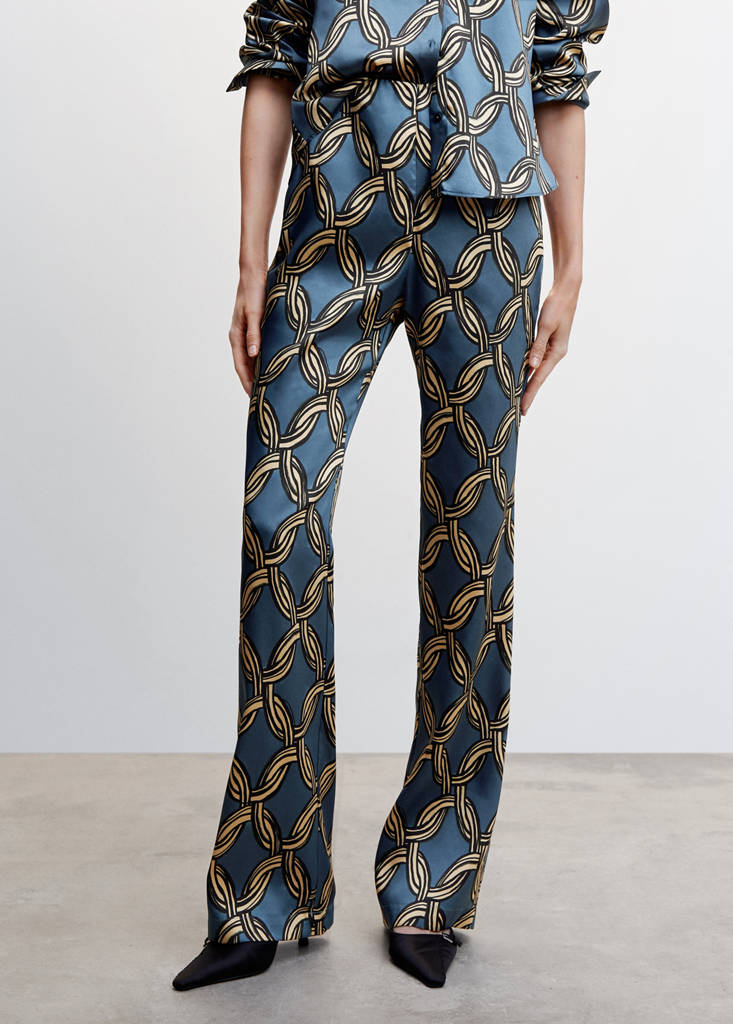 Soepelvallende stof. Satijnstof. Geometrische print. Lang model. Wijd uitlopend model. Elastische tailleband. Onzichtbare ritssluiting aan de zijkant. Feest- en gelegenheidscollectie