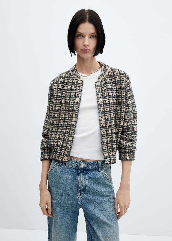 Tweed stof. Recht ontwerp. Bomber model. Ronde hals. Lange mouwen. Beschikbaar Plus. Kantooroutfits. Voorste knoopsluiting