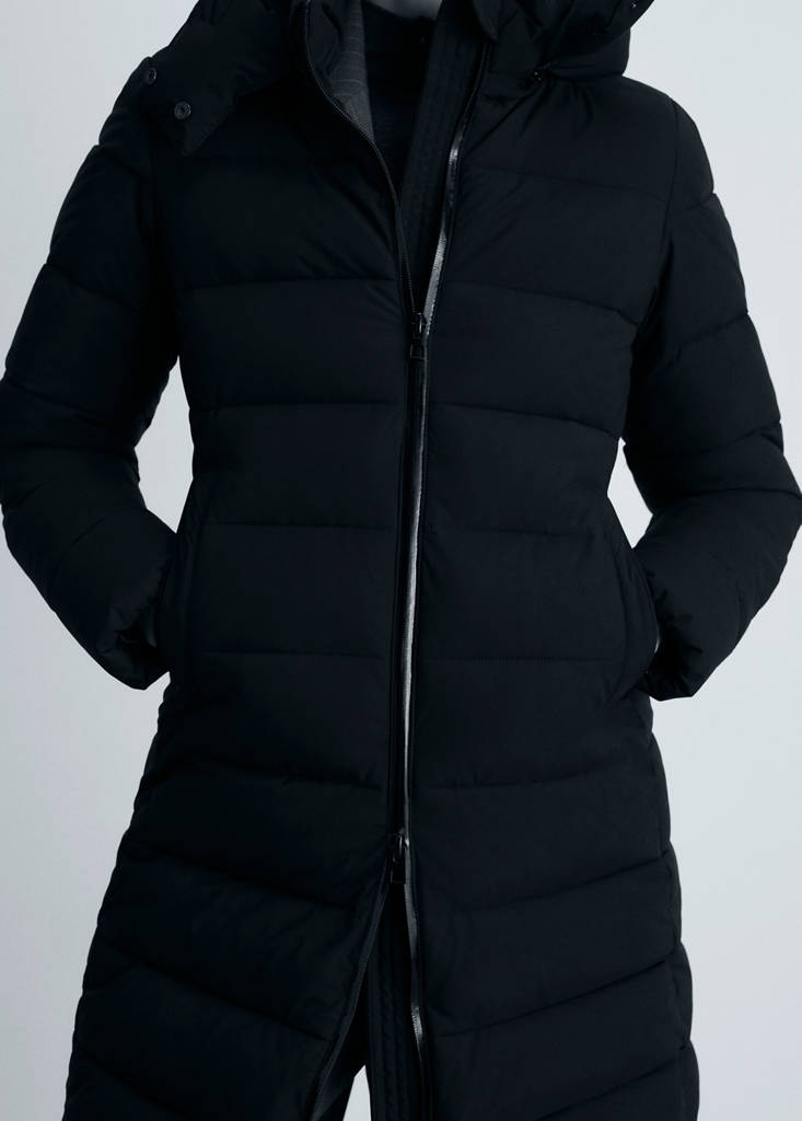 Nylon stof. Gewatteerd ontwerp. Recht ontwerp. Medium ontwerp. Hoge hals. Met capuchon. Lange mouwen met elastische manchetten. Twee zijzakken. Ritssluiting aan de voorkant. Voering. Waterafstotend: De duurzame afwerking van dit item beschermt tegen lichte regen en stoot water en regendruppels af. Beschikbaar Plus. Capuchon. Met vulling