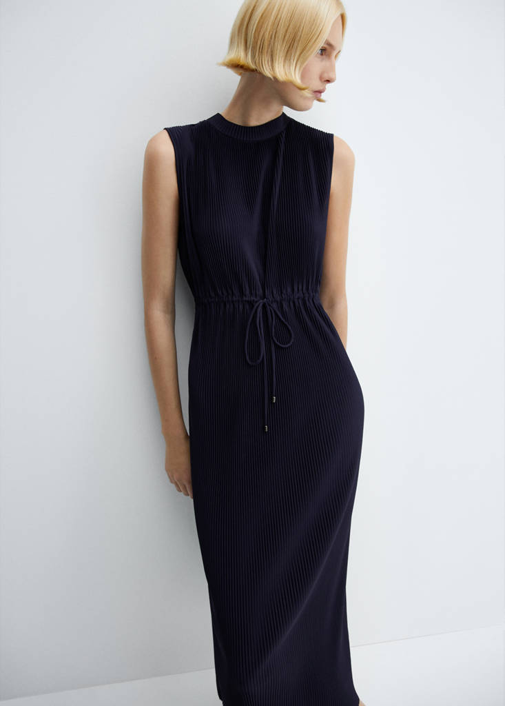 Vloeiende stof. Lang ontwerp. Rechte snit. Plissé ontwerp. Ronde hals. Mouwloos. Elastisch tailleband met striksluiting. Dit kledingstuk behoort tot onze evenementencollectie, ontworpen om je de perfecte gast te maken op elk feest, bruiloft of ceremonie.