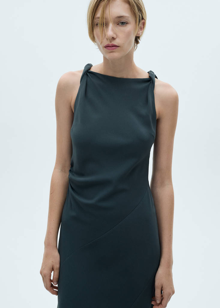 Vloeiende stof. Lang ontwerp. Recht ontwerp. Ronde hals. Mouwloos. Gevlochten bandjes. Blinde ritssluiting aan de achterkant