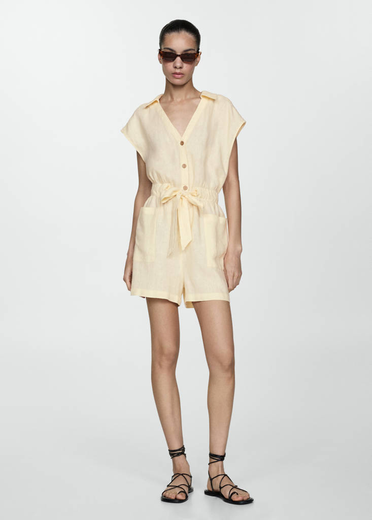 Stof van 100% linnen. Kort ontwerp. Recht ontwerp. Overhemdkraag. Korte mouw. Twee opgestikte zakken aan de voorkant. Elastisch tailleband met striksluiting. Voorste knoopsluiting