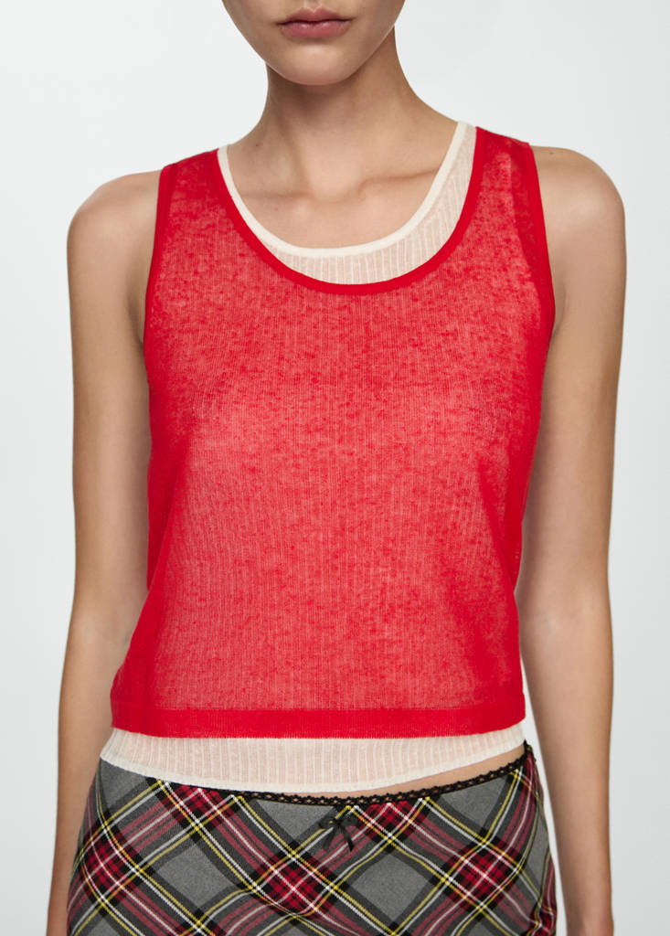 Fijn breisel. Linnen en lyocell mix stof. Recht ontwerp. Gecombineerd ontwerp. Ronde hals. Mouwloos. Brede bandjes