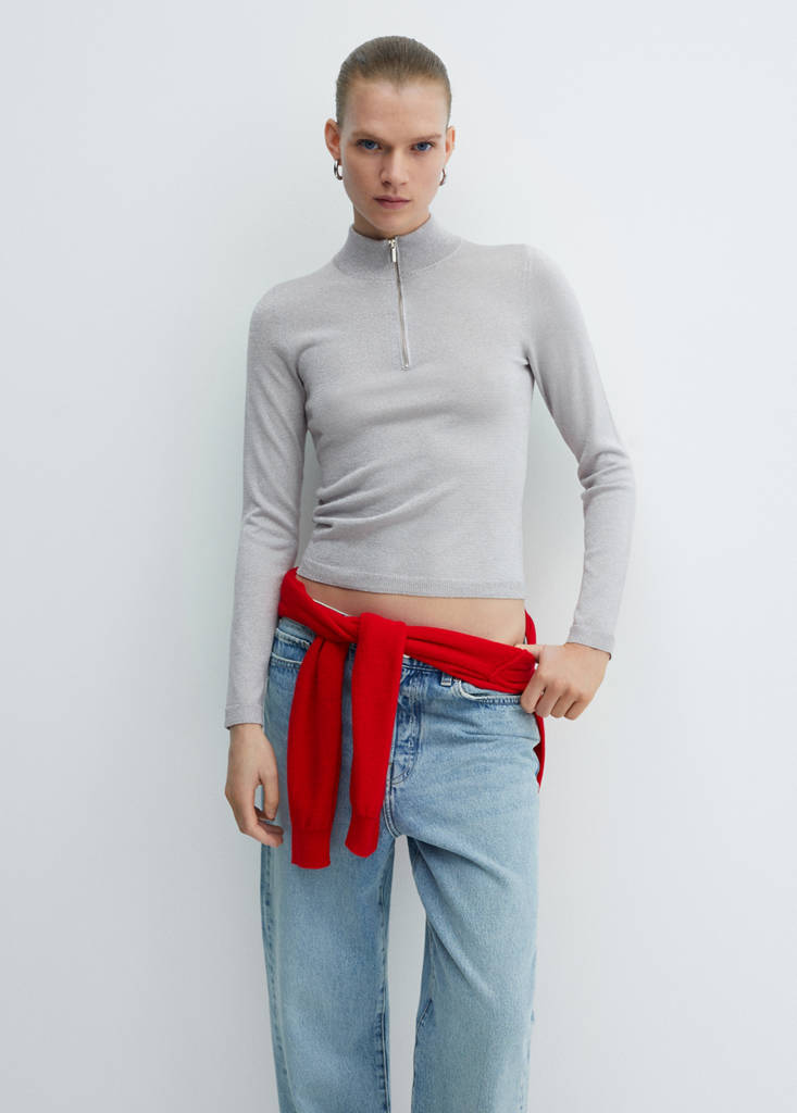 Fijn breisel. Lurexstof. Recht ontwerp. Trechterhals met ritssluiting. Lange mouwen. Geribbelde afwerkingen. Kantooroutfits