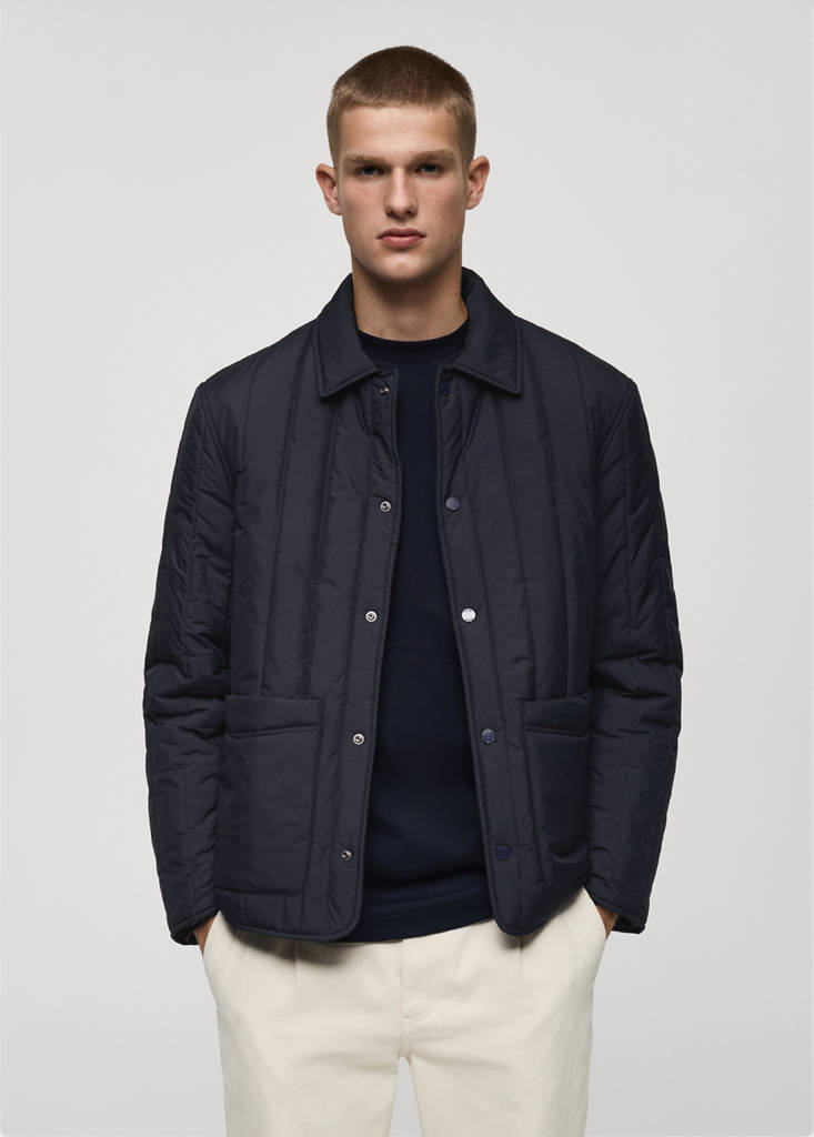 Gerecycled polyester stof. Vulling 100% gerecycled polyester. Gewatteerd ontwerp. Overhemdkraag. Drukknoopsluiting aan de voorkant. Lange mouwen. Twee opgestikte zakken aan de voorkant. Binnenzak met knoopsluiting. Rechte zoom. Waterafstotend: De duurzame afwerking van dit item beschermt tegen lichte regen en stoot water en regendruppels af. Warmteregulerend: Deze stof biedt een optimaal ademend vermogen zodat hij je op een stabiele temperatuur houdt