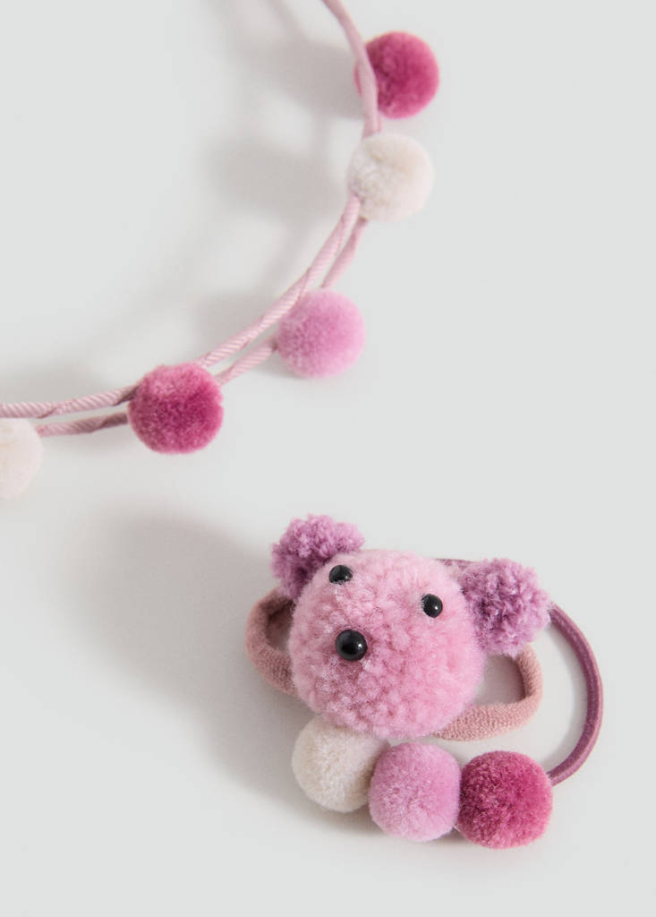 Set van haarband en haarelastieken. Decoratieve pompons. Beertjesontwerp