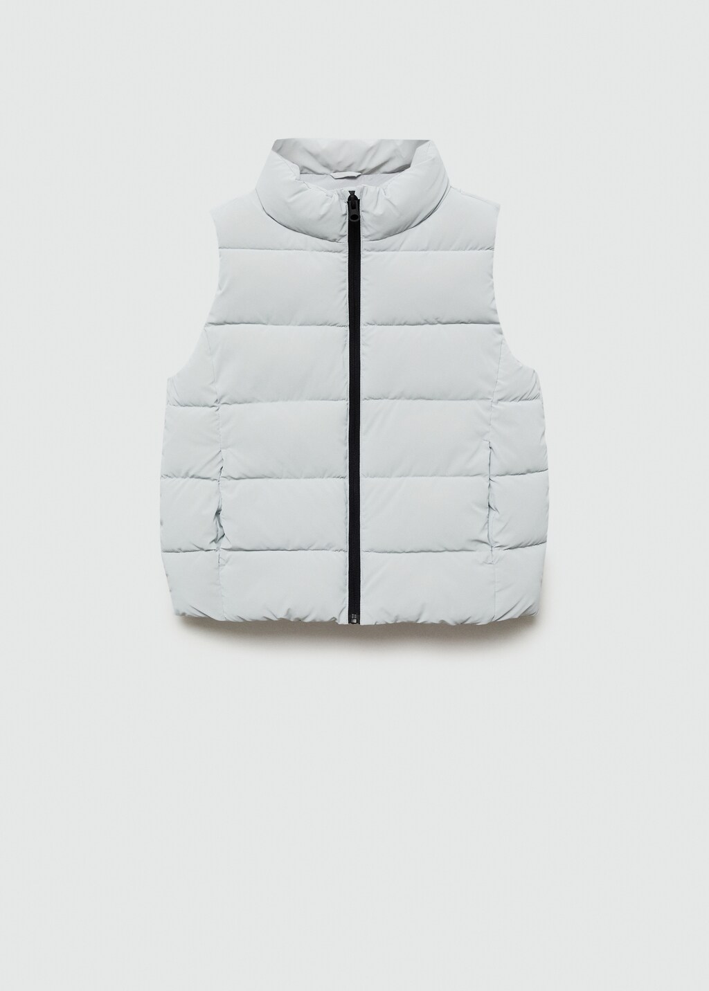Gewatteerd ontwerp. Recht ontwerp. Twee zakken aan de voorkant. Col. Mouwloos. Ritssluiting.