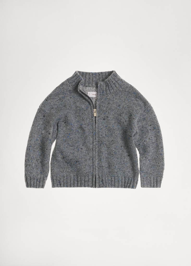 Gebreide stof. Recht ontwerp. Hoge hals. Lange mouwen. Ritssluiting