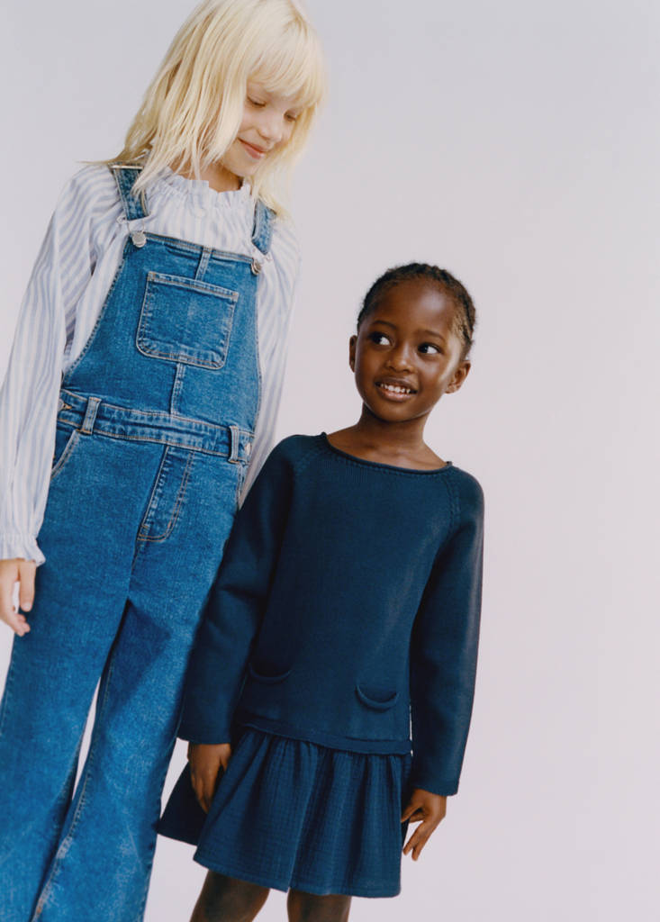 Fine knit fabric. Short design. Full skirt. Round neck. Long sleeves. Button fastening on the back section. 100% cotton fabric