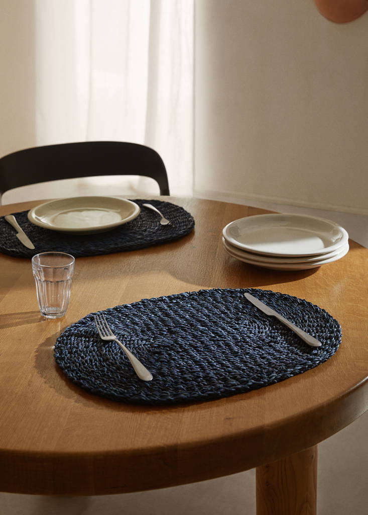 Natural fiber individual placematPrice historyInitial price struck through [kr 149,00 ]kr 149,00Current price [kr 99,00 ]kr 99,00-34 %Select a colourNight BlueSelect your sizeOne sizeNot available. I want it!Notify meOnline Exclusive. Natural fibre fabric. Oval design. One sizeDetails, composition and careStore availability