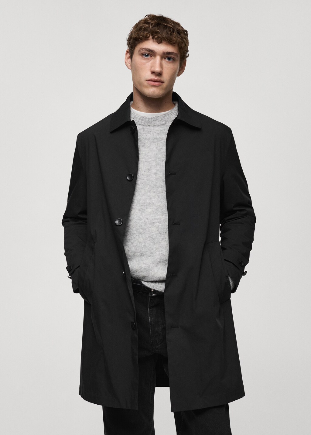 The beige colour is an online exclusive. Two side welt pockets. Long sleeves with buttoned cuffs. Inner lining. Interior pocket. Back-slit hem. Long design. Water-repellent: The durable finish of this garment protects against light rain, repelling contact with water and raindrops. Classic collar. Front closure with buttons. 100% cotton fabric.