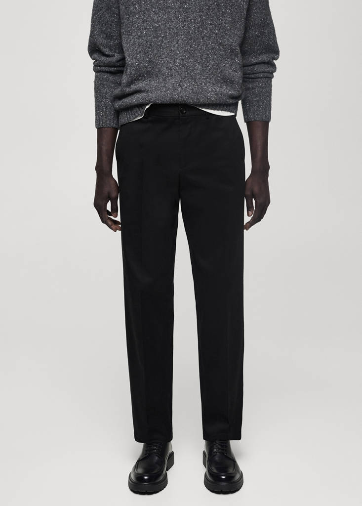 Straight-fit. Cotton fabric. Waist with adjustable inner cord. Zip and button fastening. Belt loops. Side pockets. Coin pocket. Two pockets with flaps on the back. Straight hem. Chunky knit fabric. Ironed stripe detail