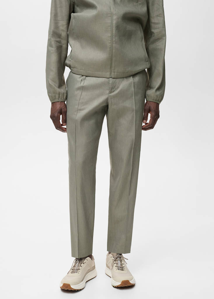 Performance Collection. Perfect for those seeking a functional and comfortable garment. Thermoregulating: This fabric offers optimal breathability to keep you at a stable temperature. Fabric blend of viscose and linen. Straight-fit. Belt loops. Adjustable elasticated waist. Front fastening with double-breasted buttons and zip. Two side pockets. Two rear welt pockets with snap button closures. Front pleat detail. Pressed crease detail at the front and back. Set available as total look