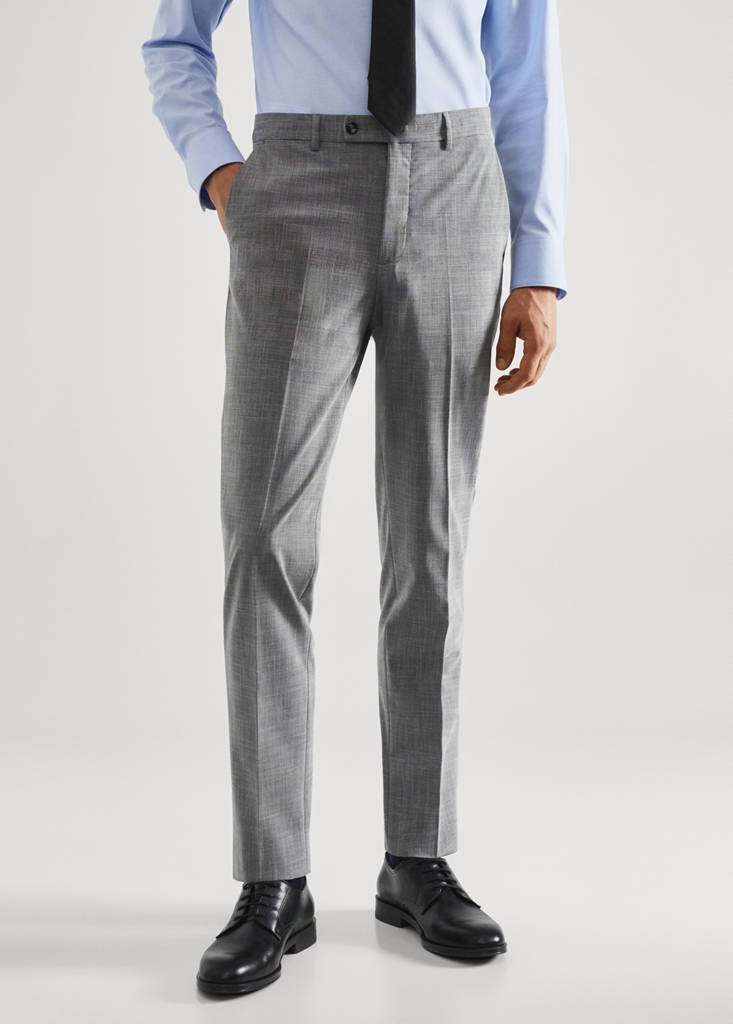 Slim fit. Fabric made of recycled polyester, a durable, breathable, easy-care fibre that provides comfort in use. Comfort Stretch: Stretch fabric for added comfort. Prince of Wales check print. Mid-rise. Detail of front and rear calipers. Concealed button, hook and zip fastening. Belt loops. Two side pockets. Coin pocket at hip height. Two welt pockets at the back. Tailoring collection. Comfort: Horizontal and vertical stretch fabric for added comfort