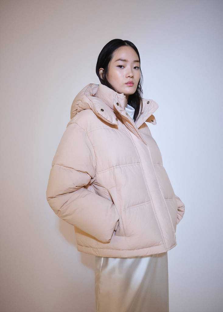 Straight design. Quilted design. High neck. Hood. Long sleeves with elastic cuffs. Zip pockets on both sides. With filling. Zip and press stud fastening. Inner lining. Water-repellent: The durable finish of this garment protects against light rain, repelling contact with water and raindrops