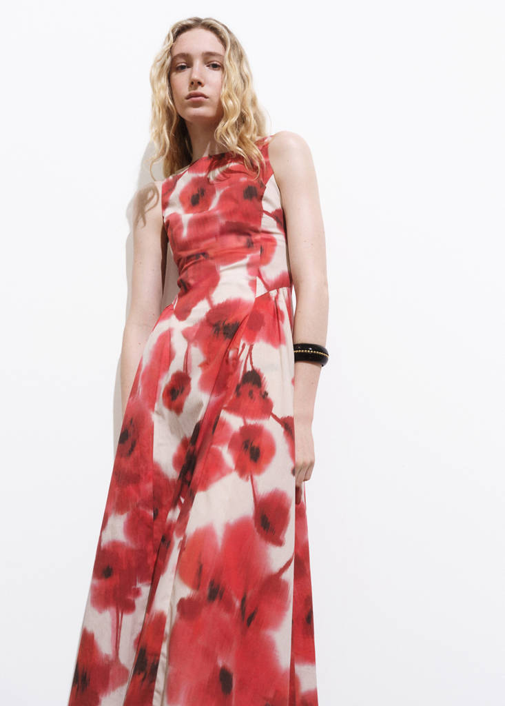 100% cotton fabric. Midi design. A-line design. Crew neck. Sleeveless. Wide straps. Flowers print. Back zip fastening. 100% cotton lining. Available Plus