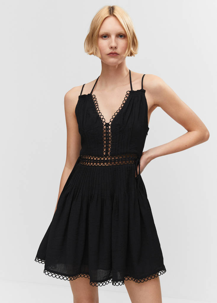 Pleated fabric. Fluid fabric. A-line design. Short design. V-neckline. Double thin straps. Adjustable straps. Bow fastening on the back. Lace panels. Openwork panels. Festival Season