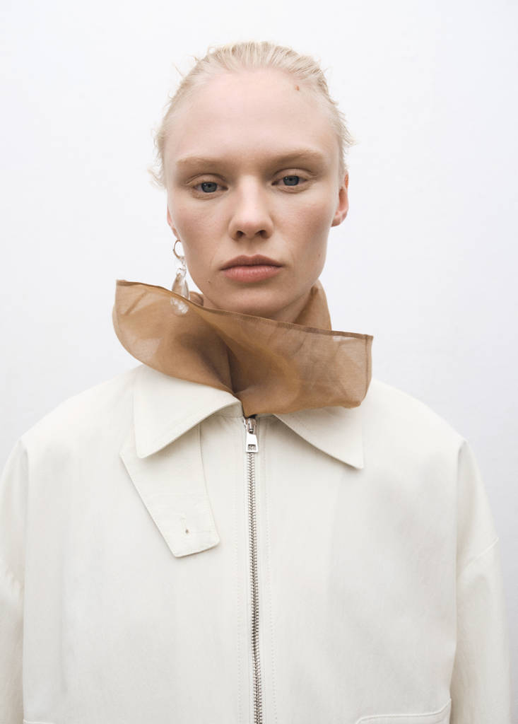 Cotton blend fabric. Oversized design. Medium design. Shirt collar. Buttoned collar. Dropped shoulder seams. Long sleeves. Loops on the cuffs. Zip pockets on both sides. Adjustable gathered hem. Front zip closure. Inner lining. Selection collection