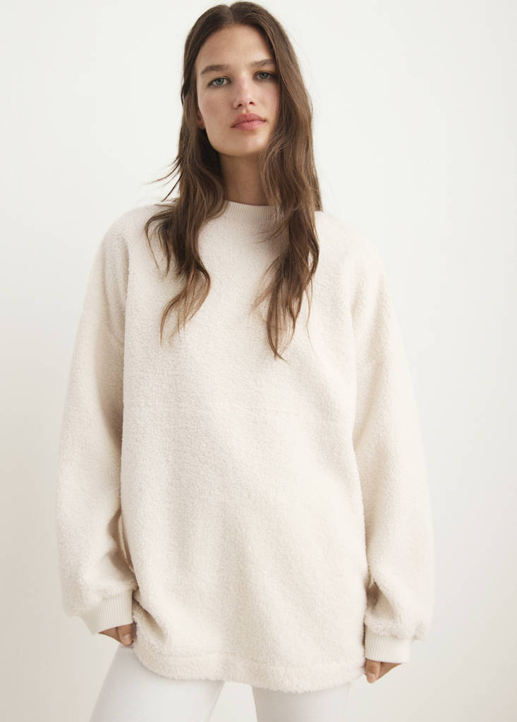 Shearling pyjama sweatshirtPrice historyInitial price struck through [kr 699,00 ]kr 699,00Current price [kr 489,00 ]kr 489,00-30 %Select a colourIvory WhiteThe model is wearing size S and is 173cm tall.Select your sizeSLast few items!MLast few items!LLast few items!DimensionsAddSherpa fabric. Soft-effect fabric. Round neck. Elastic cuffs. Long sleeves. Oversized designDetails, composition and careStore availability