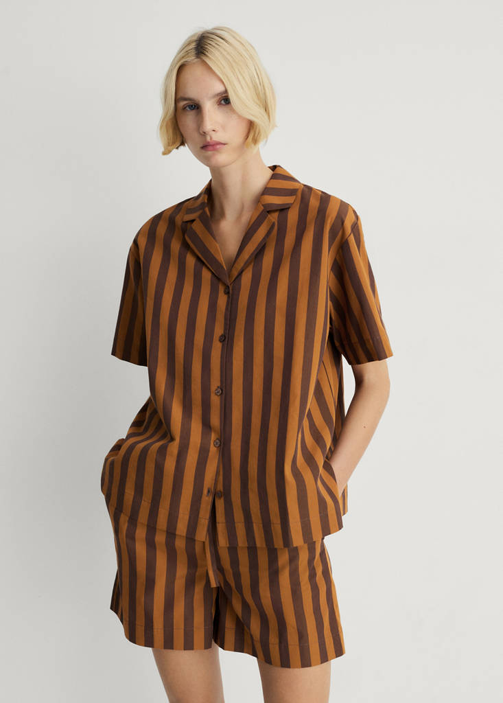 Pyjama top. 100% cotton fabric. Shirt-style V-neck collar. Button up. Short design. Two-tone stripe print. Combines originality and elegance with comfort for your days at home. Provides comfort and freedom of movement. Available in different colours