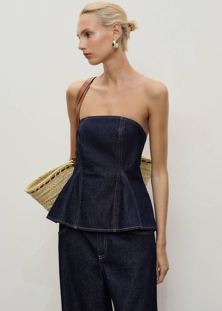 Crafted from cotton denim fabric, this top features a peplum cut and a bandeau design. It is completed with matching jeans, perfect for a total denim look.