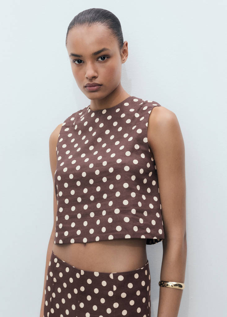 Linen mix. Crop design. Straight Design. Polka-dot print. Round neck. Sleeveless. Back zip fastening