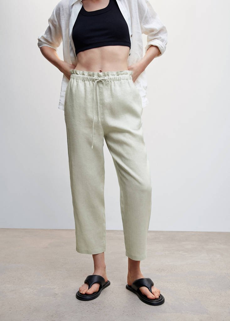 100% Linen. Straight design. Cropped design. Two side welt pockets. Elasticated waist. Lace fastening. Inner lining. Plus Size Available