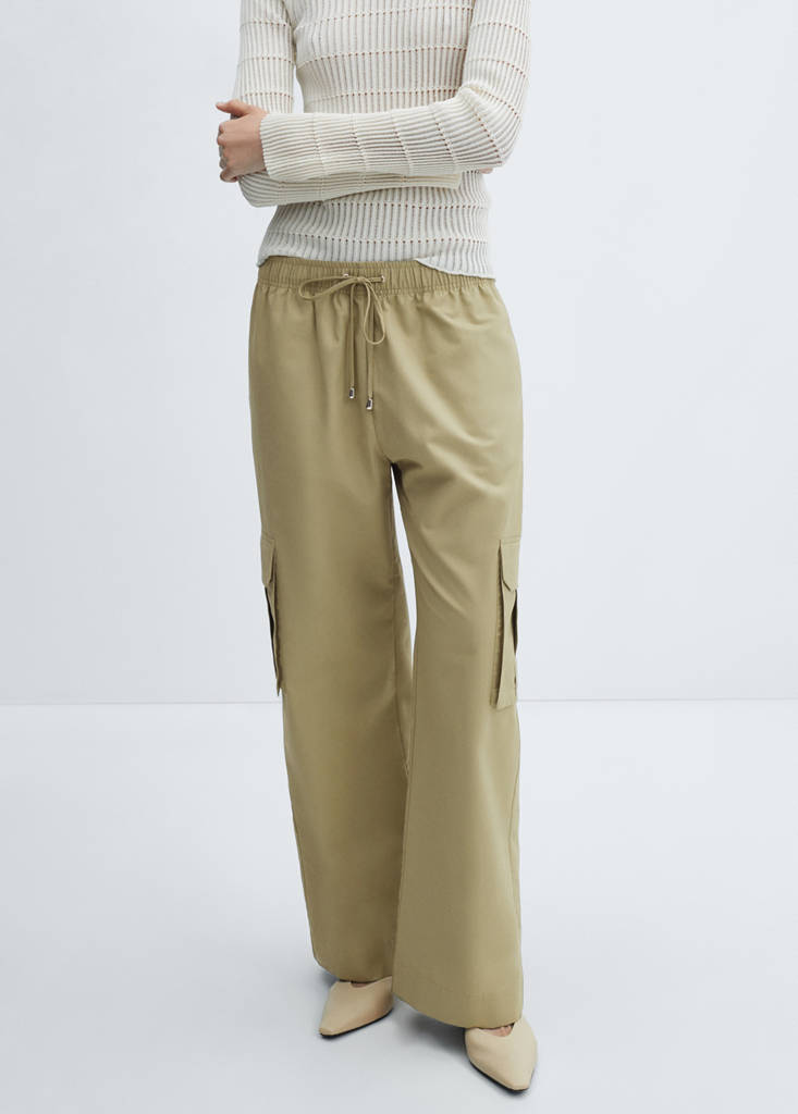 Cotton blend fabric. Long design. Cargo design. High waist. Two side pockets with flaps. Elastic waist with tie closure